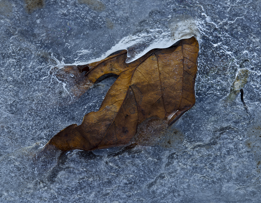 The title was somewhat misleading. The leaf was probably locked in the ice at one point but some thawing has separated most of the ice from the leaf. The leaf is partly above and partly below the level of the ice and does appear to float. In the waning light of day, the leaf sections below ice level were very darkly shaded. While there is little detail in these shaded areas, I liked the strong contrast between the ice rim and the dark sections of leaf which took this image out of the 'ordinary' of other scenes from this shoot. Here is one of the other images. Karl |