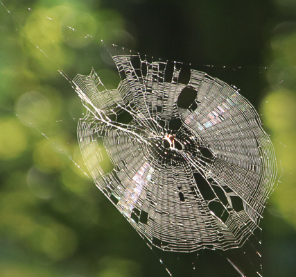 Hi Judy, I get fussy about cutting off mother nature's beautiful creations. Here's my crop and clone version of the image. I darkened some highlights including the strands outside the web. They are necessary to the image but don't need to be super bright. I just cloned them with background at 50% opacity. The light is beautiful and the bluish reflections contrast nicely with the background. Lots of people carry spray bottles of water. I would first photograph the web as you found it and then try the spray. Often the spray will scare off insects that can enhance the image. Very well done lighting! Karl |