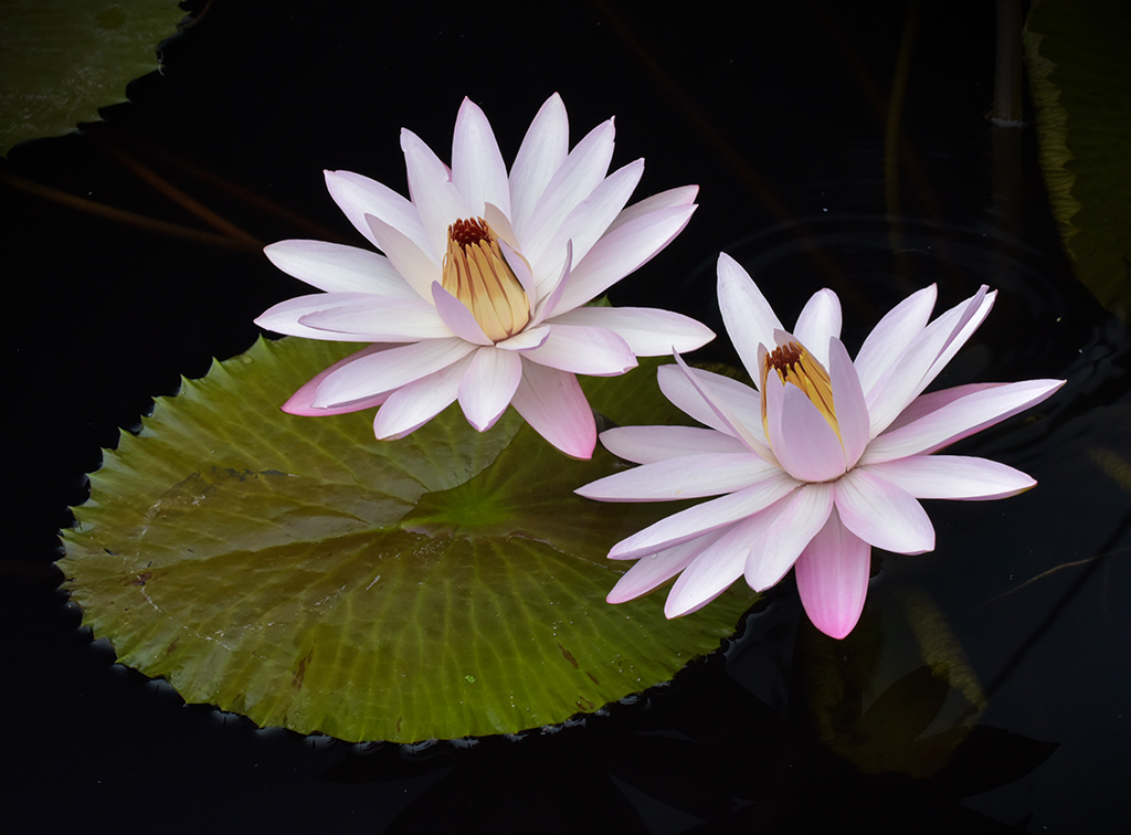 We both favored using a polarizer which can darken the water to whatever degree one wishes. The saturated colors of the lilies pop better against a darker background and require less enhancing in post. Since I also do photojournalism, I favor darker edges rather than lighter to better contain the viewing area. My image was taken at the same place as yours with a Nikon D810 and 80-400mm lens set at 135mm with partial polarization. Rather than cloning out the leaves at top edges, I darkened them substantially to leave some environment but still concentrating on the subjects. From this point the image could artistically go anywhere with post processing filters or effects. Karl |
