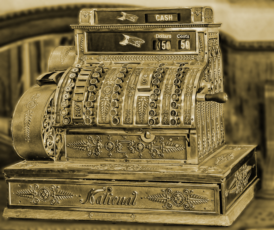 Hi Lauren, I love the cash register. My friends at Finley's Art Shoppe in Newark, DE, have one that they still use. No plug-in or batteries required! The detail is terrific. To make the register stand out better, I created a Gaussian blur layer and masked out the register itself. The register is still tack sharp and the background is a bit out of focus. Since it's an olde machine, I applied some antique color with the Colorize function in the Hue/Saturation tool. You did a fine job in correcting the distractions and reflections. I would prefer a little more 'breathing room' around the machine. Karl |