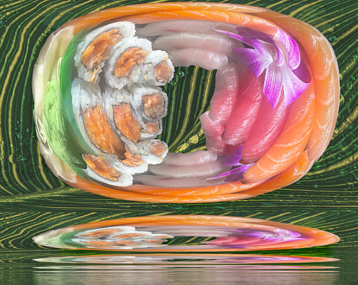 Hi Peter, A wonderful interpretation of the sushi dish. I like the application of polar coordinates and multiple reflections. I suggest making the image more dimensional by increasing Clarity (midtone contrast) of the sushi and slightly desaturating and softening the leaf background which, by the way, was a brilliant addition. Karl |