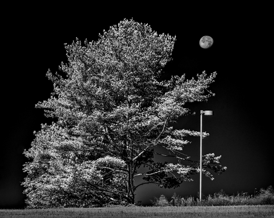 Hi Lauren, I have an all wavelength Sony conversion and use filters to get the effect I previsualize. While there is nothing wrong with your workflow, I suggest trying a filter on your lens that blocks all visible light (390 to 720 nm) and transmits only infrared (usually referred to as 720 nm and higher). The most common of these filters is the Hoya R72 with similar products by Kolari Vision 720 nm, Ice HB720, Urth R72, and Tiffen #87. Filters that start further in infrared include Ice HB760, Kolari Vision Pro Gen 3 780 nm, B&W 093 830 nm, and Kolari Vision 850 nm. The R72 and above filters will produce a much more dramatic dark sky. The attached image was taken in a parking lot on a clear, sunny day around 11 AM with a Nikon Z7 converted to 830 nm infrared. The moon was very, very faint to the naked eye but popped out dramatically in pure IR against the black sky. The camera captures reflected infrared. The moon's surface and healthy foliage reflect a lot of IR while space and cloudless sky reflect very little and appear black. Your camera is capable of a lot by using the appropriate filter on the lens. Try a 720 or 830 nm filter for dramatic clouds against dark sky. For visible color + infrared, I like the Kolari IR Chrome filter which sort of emulates the old Kodak Ektachrome Aero Infrared film with appropriate post processing. IR is a whole photography world that I love and include in the Fun Photography class that I teach at the University of Delaware. Have fun! Karl (Group 79) |
