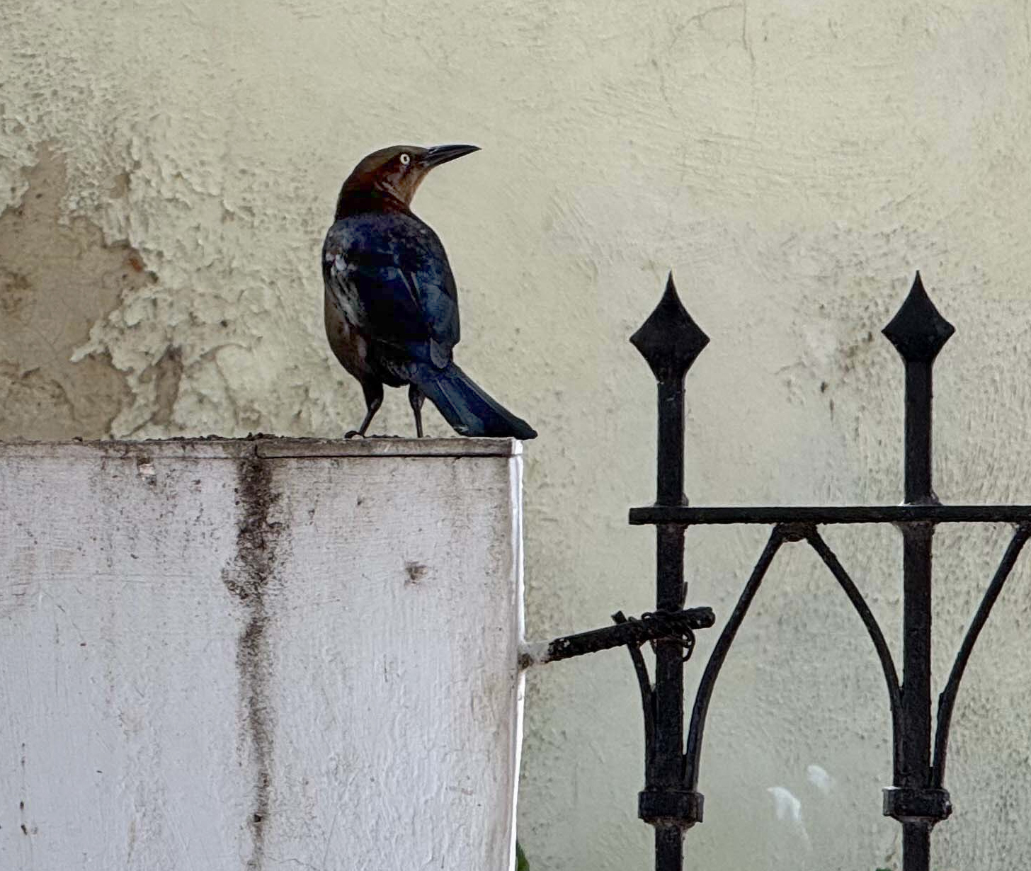 Hi Judith, A common grackle it may be, but it sure sounds like it is acting like a crow. Take Bruce Morrisey's class 'The Crow' to learn more about this bird that communicates with humans as Poe immortalized. The original is more asymmetric and I like that sort of composition better. The ironwork makes it appropriate for the Barnes Museum. Here's my alternative interpretation with lightened bird, different cropping, and a Firmani flip. Karl |