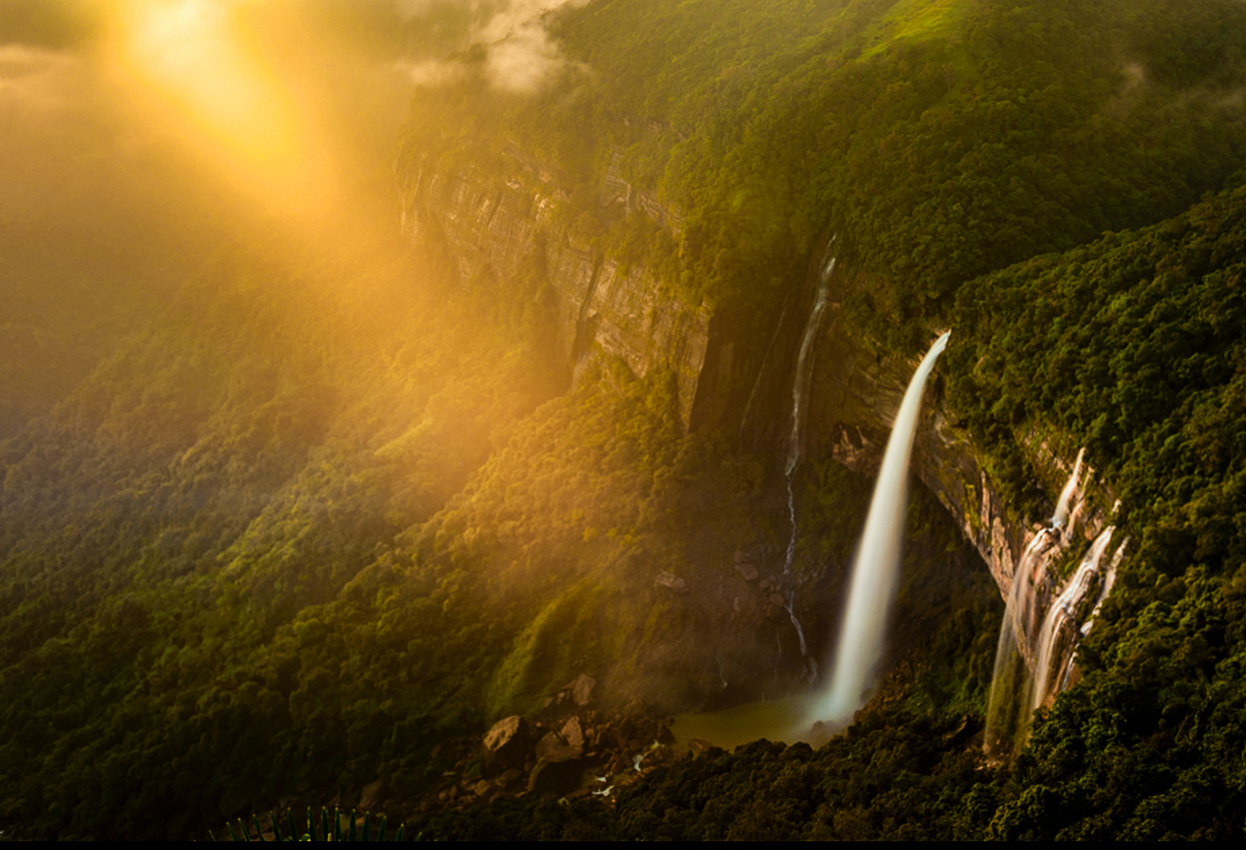 The falls is impressive but the sunbeam overpowers the falls because it is the brightest part of the scene. Thus I offer several suggestions.