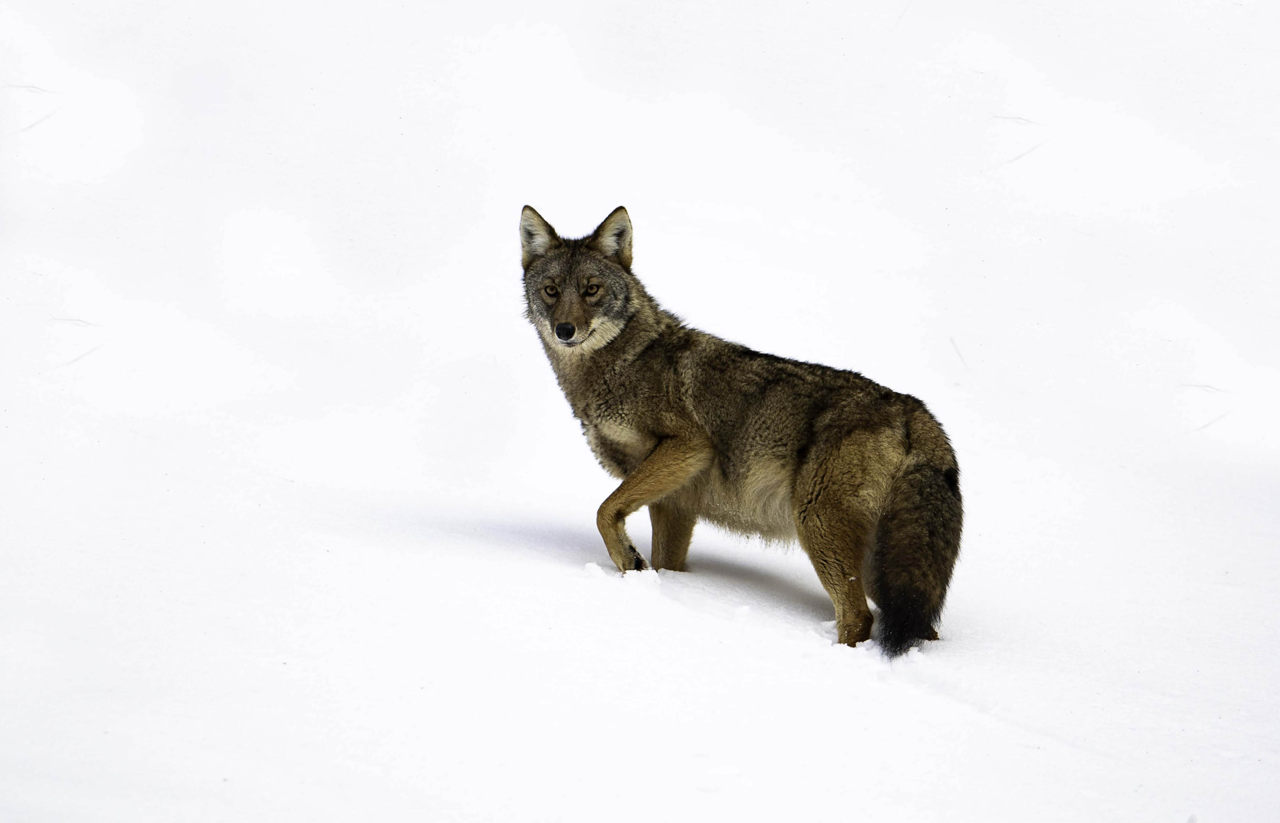 You really outdid yourself with this image. The rich full color of the coyote's coat against the blemish free snow is quite magical. The raise front foot imparts a feeling of motion and it is that raised foot that makes the image work. May I strongly suggest that you crop the image as shown inmy attachment. The animal is moving and you crop takes away that feeling. The story is the coyote, while you need the snow you don't need so have so much as it reduces the coyote. |