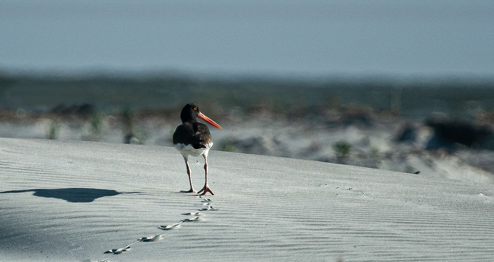 There is so much to like about this shot. I love these bird alone on the beach shots. This one has a leg up on many others because you have the footprints and they are even laid out in a curve pattern! Shooting with a long lens at near eye level and a little target you often get that blurred foreground so my fist suggest is to just crop that off, especially when you have already cropped so much. It just cleans up the image. Then you have that wonderful shadow to add depth and interest. Your bird is looking to camera right and since you have so much space on the right I would suggest repositioning the bird so he has space to walk into. Since I put this in Lightroom to do the crop I did a quick Photoshop edit and removed some bright white areas in the water so clean up the background. Then I added a layer mask on the foreground and increased shadows added texture to add some detail to the sand.