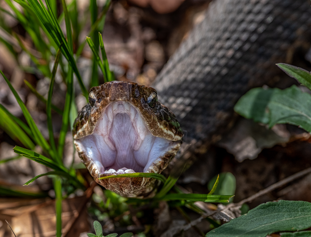 I stepped near the snake and saw his gaping mouth. So I stepped back. He partially closed his mouth. I stepped forward and he opened his mouth even wider again. So I stepped a tiny bit closer and he opened super wide - and that's when I took this shot. It's actually an eye-level shot because his/her head is tilted back. I took several shots before it slithered back to the creek. They are basically the same pose but with the mouth not open as wide. One of these shows the eyes pretty well. But I really wanted to feature that cotton mouth with the detail. I will process the other one to see how it looks with the eyes. Thanks. |