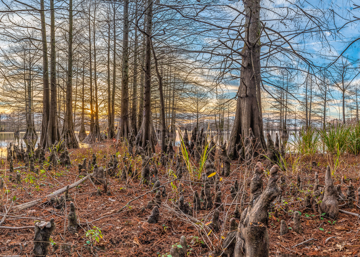 Thanks to everyone for the comments. Very helpful. I tried to get rid of the purple boundary paint but couldn't do it in Lightroom. As for the subject, maybe the easiest thing for me to do is to change it. How about "Tangle of cypress knees and trees on a boundary line". Has a nice ring to it. Joking. |