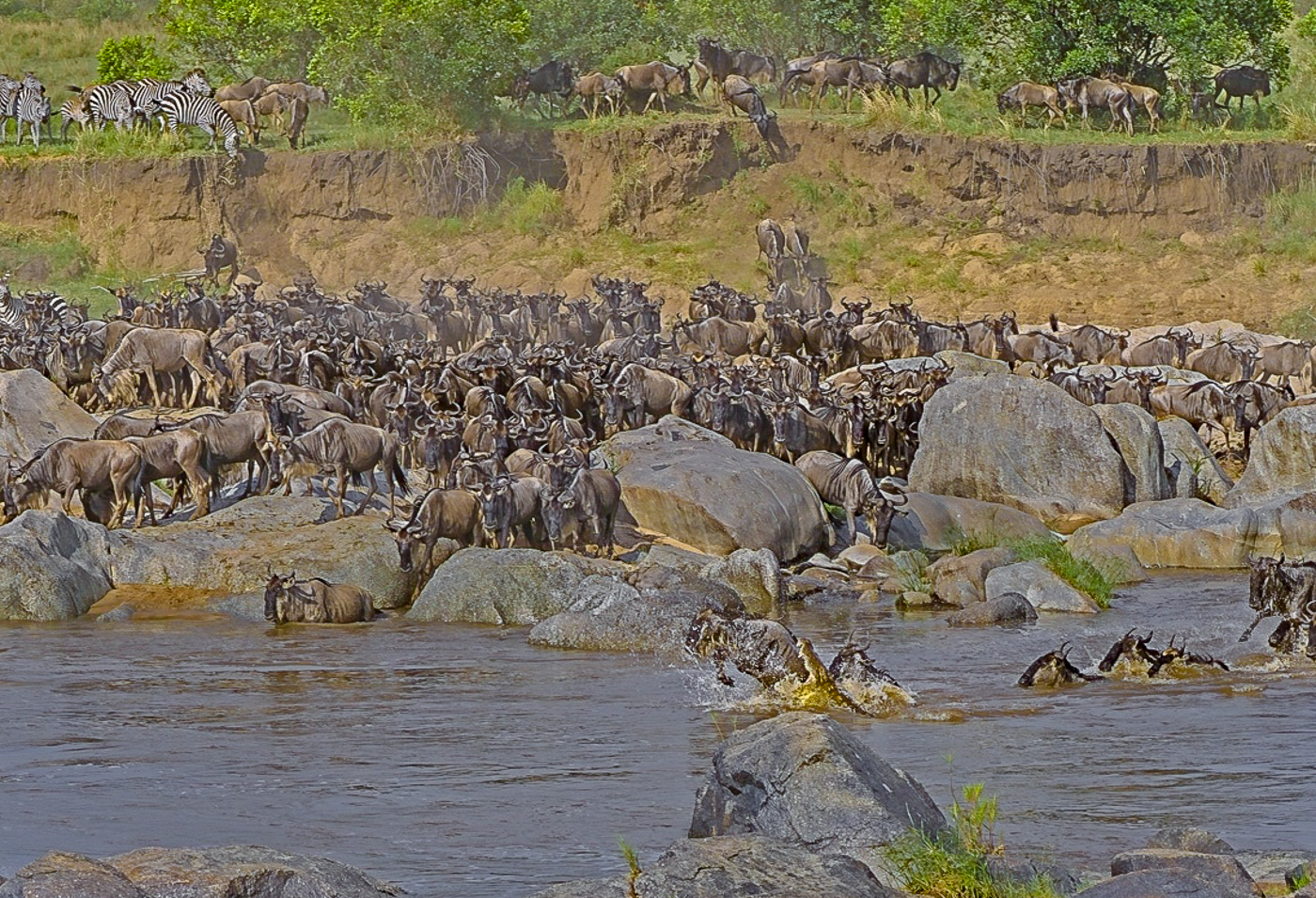 Considering my past transgressions I'm in no position to criticize anyone for over-cropping. But I do think less cropping would show more context. In fact, I really like the original. What a thrill it must have been to witness that scene. I downloaded the original, cropped it a bit and worked the sliders in Lightroom. I know this might change the subject a bit, since it's about the crossing scene rather than focusing exclusively on the croc, but I find this to be a fascinating photo. Great capture! |