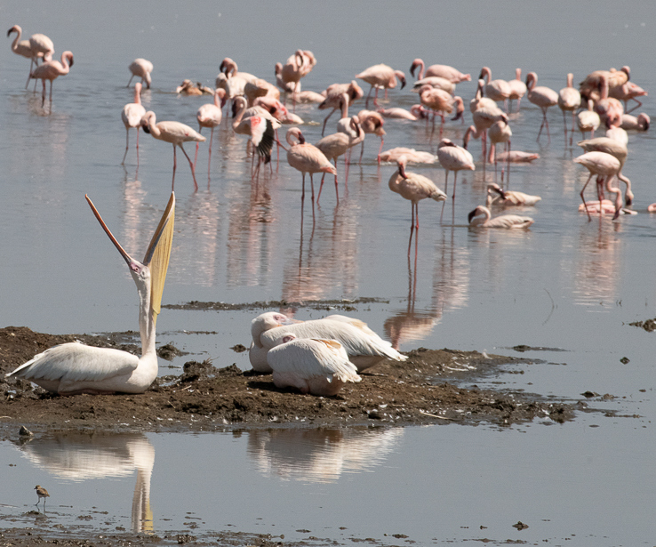 Hi Susan, very nice image. How wonderful it must have been to witness all these beautiful birds in their natural habitat. Great comments from Larry. But you're stuck with trying to sharpen this image and give it less of a washed-out appearance. I don't know what software you are using, but I would try some additional sharpening using something like the new Topaz applications. Also adjusting the saturation to bring out the blue in the water. Just for fun I tried a different crop. I know the flamingos are ordinary but they could be used more to make the image more beautiful, IMO, and add context. Attached. |