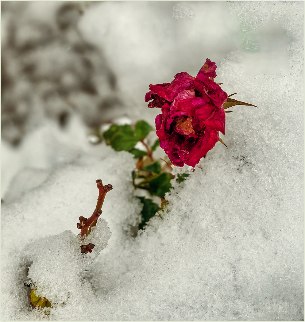 I like the image, the lines of the flower and stem. I feel the color of the rose can be brought up a little, and I would crop the image as I feel the rose is the subject and not the snow all around it. I cropped the image, then ran it through Luminar Ai. This is what I got. |