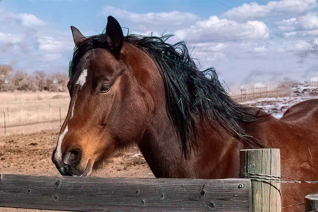 A very nice image. My suggestion would be to remove the houses in the background as well as the branches IN front of his head. I just removed them quickly and now your eyes are on the horse. |