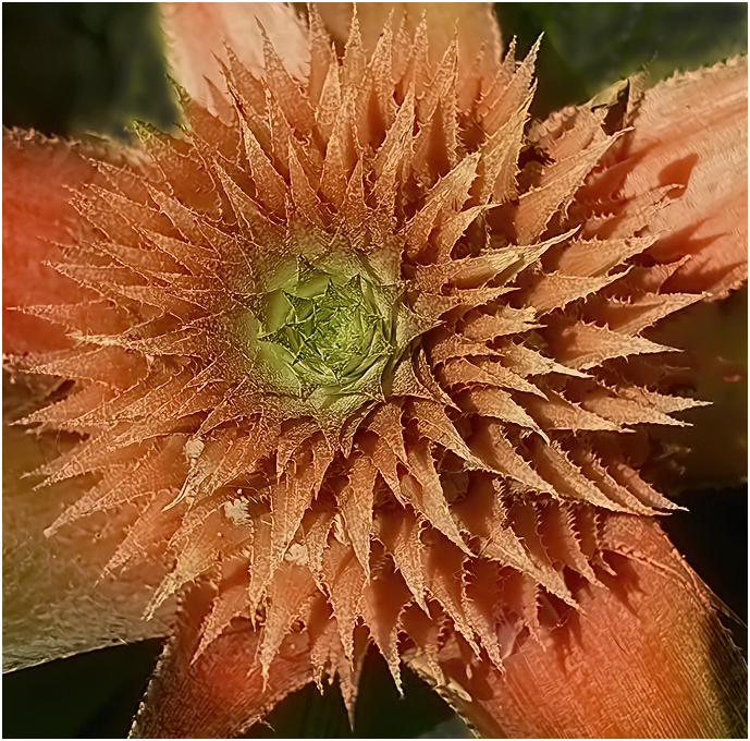 very nice image, I like the coloring, but I feel it should be cropped closer. As I look at it now my eyes goes to the Green, before the flower. What I did was a tight crop of the flower and darkened the Green leaves. I also added a small white frame (3pix) around the image, which, I feel brings your directly to the center of. the flower. |