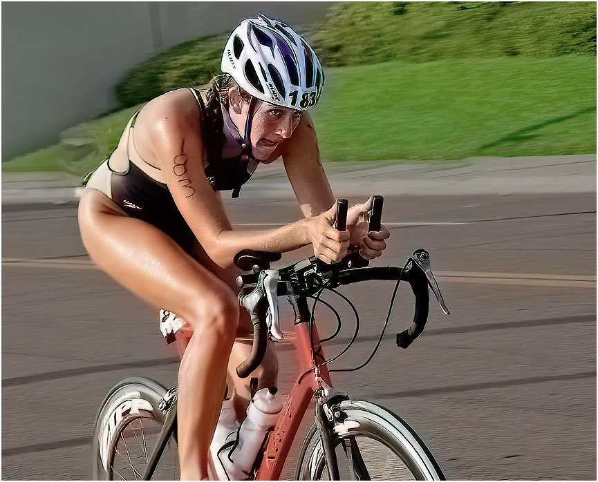 i like the image and the expression on her face, as see peddles on. I do feel the person on the sidewalk and the runner should be removed. The subject is the bike racer. |