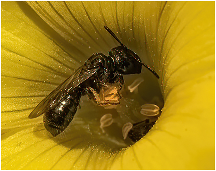 A nice capture, but I feel it needs a lot more work. What you did fine, but it needs more work. If you want to keep the image as you have it, you should remove the brown area on the bottom right side. As it is now, as you look at the bee in the flower your eyes go to the brown area on the right side. I like the bee in the center of the flower. You can crop the image down to that area. I cropped the image down, just to the center of the flower, ran it through Topaz De-noise Ai and Topaz Sharen Ai. This what I came up with. Pollen all over the bee. |