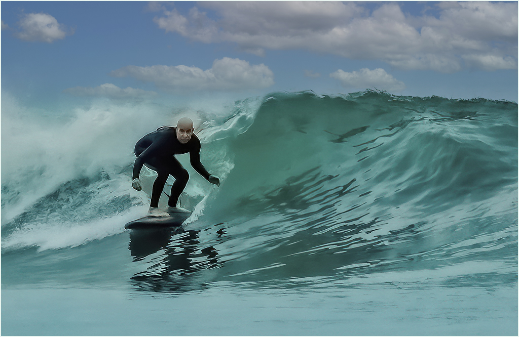 A nice image of the surfer, but I feel you need more color separation between the wave and ski ran it through Photoshop "sky Replacement" and this is what I got. |