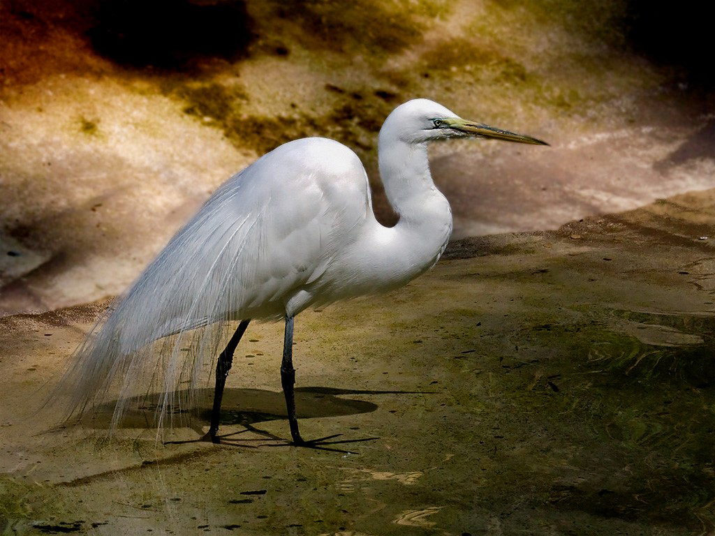 An excellent image of the Egret.A very sharp of the bird .My only suggestion would be to add a little light to bring up his eye. I would remove the couple of black spots in font of his neck and below his beak and the one to the left of his feathers, on the background. |