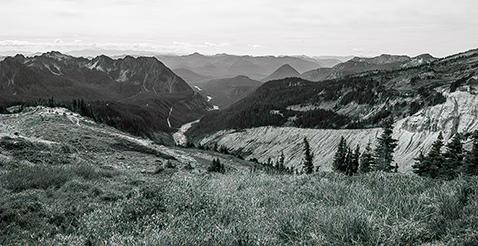 I like you image, my eyes go from the grass IN front, down through the valley and the mountain range. I ran your imag through Topaz DNoise and cleared up some of the noise and I can ow see some of the clouds, over the mountain. |