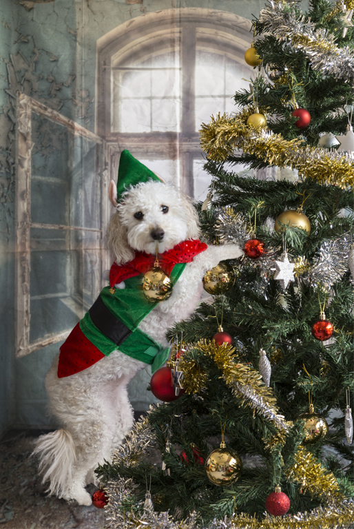 I think the idea of Coco decorating the tree is perhaps a bit hard to convey since she has paws and not hands, and I thought why not have her to do what a dog does? So my take on this would be to have Coco decorating the tree with an ornament in her mouth.