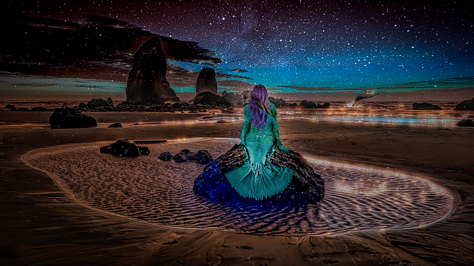 I like the mystery of this image, it has all the elements of a fantasy. Your intent really comes through to me as the viewer. I would like to see the mermaid with more of an aura of light around her. My attempt to lighten her up a bit came with more sparkles on the rock she's sitting on, which I kind of like. I did darken the sky and crop it down a little. |