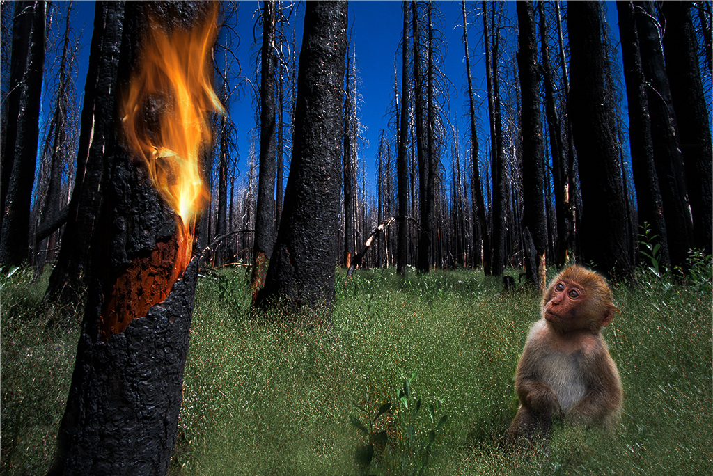 I love the concept, and the elements work really well together. The contrasting dark blue sky, green grass and orange fire are wonderful. The monkey in both versions have a good visual connection to the fire, but I prefer the second version (#3) because he seems more fearful and cautious of the fire than in the first version. But, #3 does get cutoff and that did bother me. I thought that maybe by extending the canvas down in PS by 10%, it would allow enough room to clone in some grass and give him a base for sitting. I do like the vignetting that Kathy did in her version also. It creates more moodiness. |