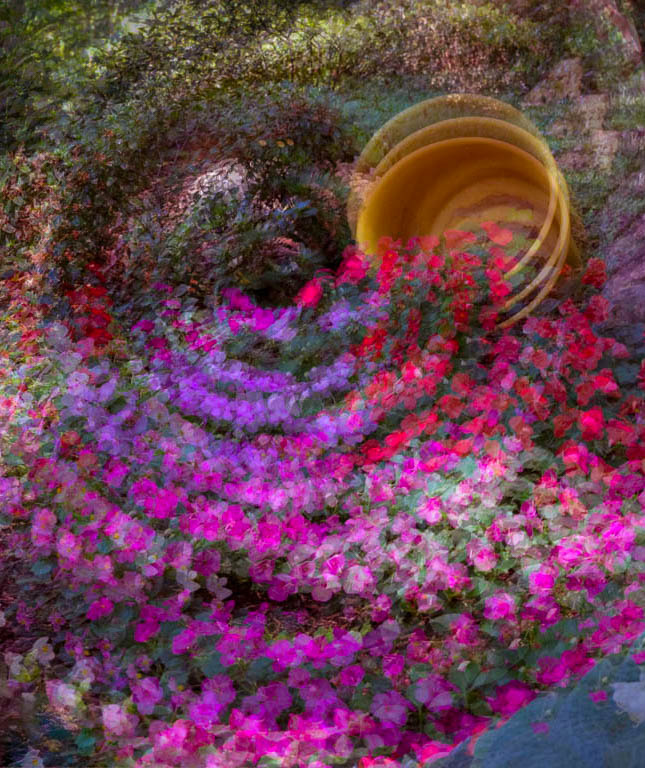 Hi Kathy, what a lovely technique, it really looks impressionistic! I like Tom's idea to leave the basket as the only non blurry element in the image. I love the main swirl of flowers in the foreground, and that's where my eye lingers. I think the tree trunk and the brighter areas detract from the image, and I did a crop to see how it might look without those things. |