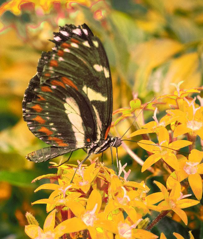 Another option is to add a texture over butterfly, add white layer mask to texture layer, and then remove with black brush starting in middle of body at 80% and working with lower and lower opacity by increments slowly out to 10% along edges. When it works, texture appears to soften edges disguising camera movement or shallow DOF. |