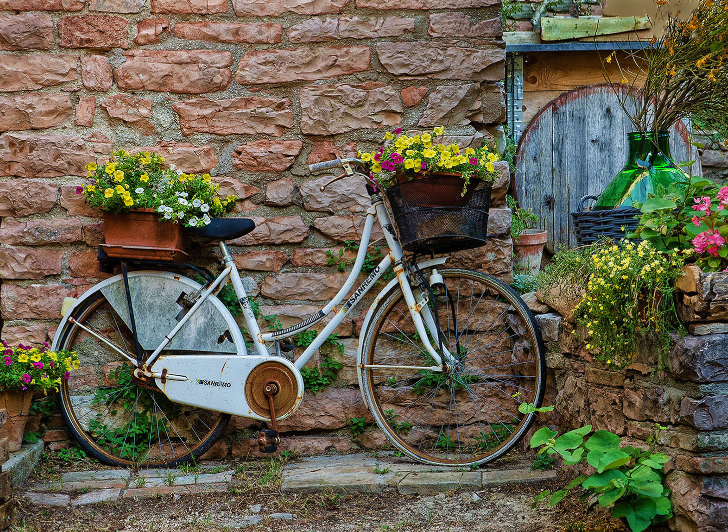 I am so attracted to this image as a gardener, photographer, and lover of old-world things. I can make an interesting story as I take in the scene. Well composed and skillfully balanced. I like the softness of the garden elements against the rough stones, shiny green glass, and rusty metal of the bike. Lots of interesting textures and shapes for the eye to explore. Really enjoy the variety of complementing colors. Just for curiosity, I cropped it tighter for simplicity, darkened the lighter elements above the window, and added a bit of vignetting. Both versions appeal to me. Thanks for sharing. |