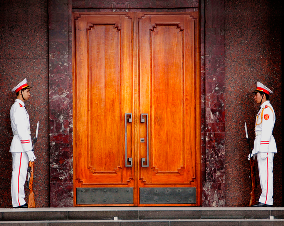 You’ve done a great job of building the top of the doors, Richard. The symmetry works well but if it were mine, I’d tidy it up a bit more by cloning out the white blocks on the bottom step and by using the Photoshop Transform tool to make the bottom step horizontal. I agree with Oliver that it’s not clear what you want me to look at. You could make this clearer by changing the lighting. Below is my attempt to do this using the NIK Darken/ Lighten Centre tool, putting the centre in the middle of the doors and darkening the background somewhat. |