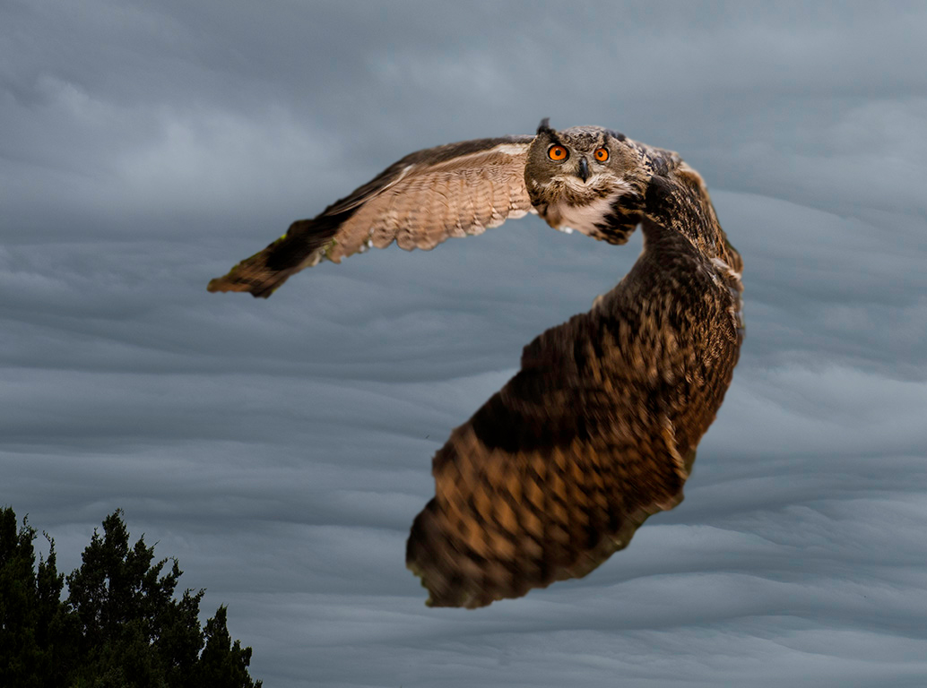 This is a very striking image, Richard. As it stands though the owl looks as if it has been cut out and imposed on the background. I took the liberty of taking it into Photoshop and running around the edges of the owl with the 'blur' tool to soften the edges. For me, this makes it a lot more realistic - see below. |