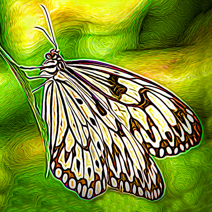 The filter has produced an attractive stylised image, Oliver, but it does still look like a photograph of a butterfly on a leaf which has been manipulated with a filter, as there is a lot of negative space which detracts from the main subject. I thought that if you homed in on the butterfly to remove all this then it might look more like a Van Gough Painting rather than a photograph. My attempt at this is below. |