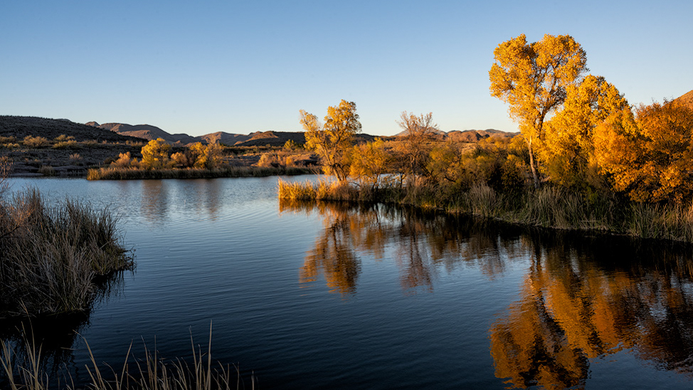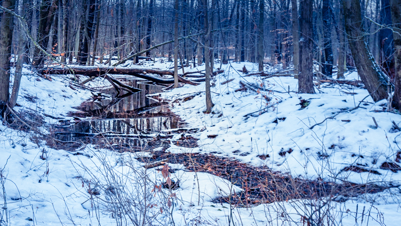 I think the primary subject is the horizontal tree and it's reflection. The other trees and the snow play a supporting role. I liked the cropping suggested by the others so I applied a 16:9 crop. I also like the idea of toning the image so I cooled the color temperate of the entire image and then warmed up the central area. I like to blue to enforce the idea of cold and since our eyes are drawn to warmth I used that where I want people to look. Also, I found the bright yellow leaves in the foreground to be very distracting so I desaturated them a bit.