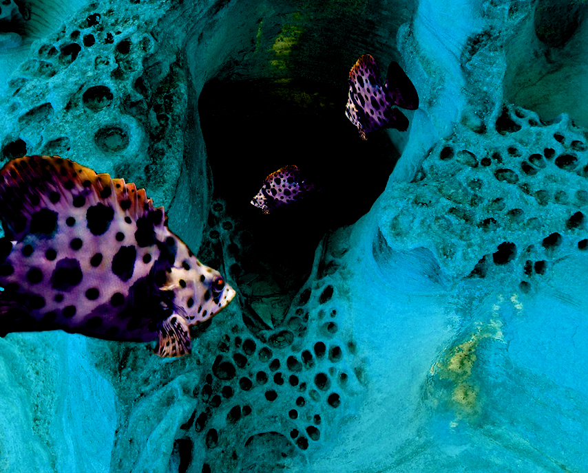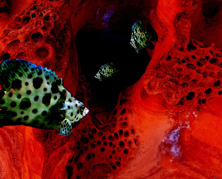 Terrific composition, and I like the colors. But you're right that the rock textures seem unnatural. When looking at the fish, they don't seem completely integrated due to the contrasting textures.
