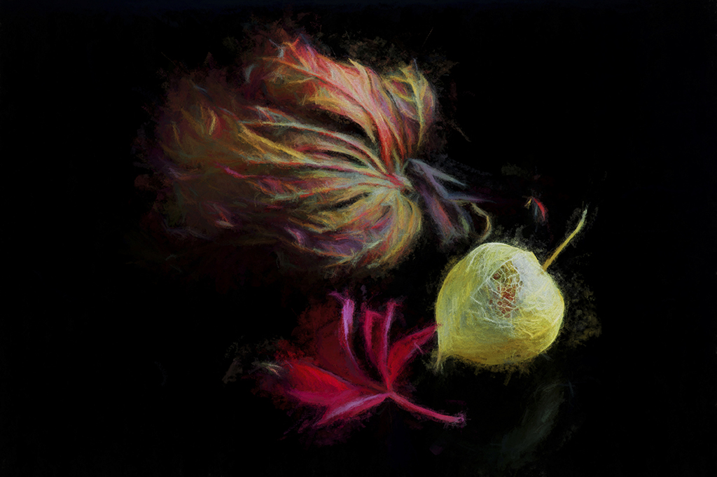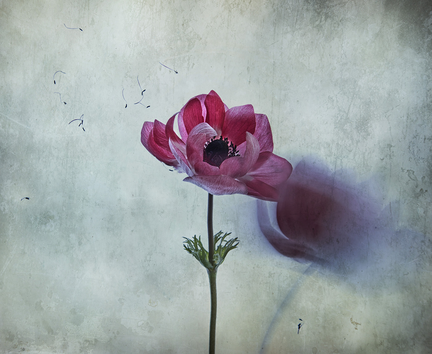 Tripod with camera in situ,using a cable release ( LEFT HAND ) allowed me to position another flower on the lightbox to the right.This one in my right hand and on the base of the lightbox i held its stem. On pressing the cable release i gently rotated the stem to the right just by moving my forefinger and thumb,ensuring i remained side on out of camera .Use of the slow shutter speed with cable release and tripod, made it possible , however the shadow left from the 2nd moving flower was very faint