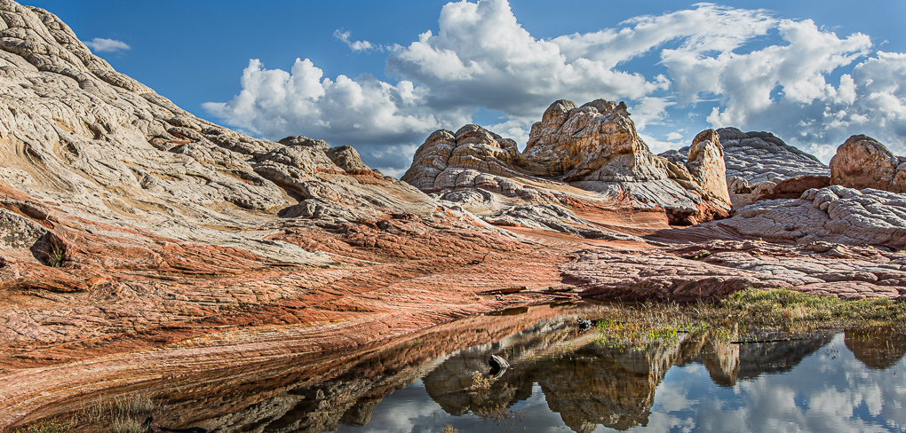 I have attached a newer version, having cropped from the bottom to a point which maintains the lead in lines of the rocks from the bottom left. I have also tried to make the whole image less bright and further dimmed the reflection area and reduce the saturation of the grass area in an attempt of reducing the distraction of that area more. |