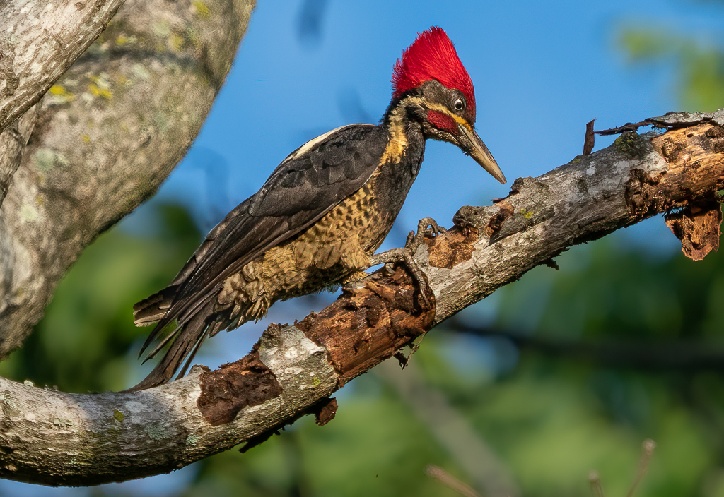 I attach a revised crop having rotated it as well as cropping out the top left branch, which allows me to keep a little more space above the crest. |