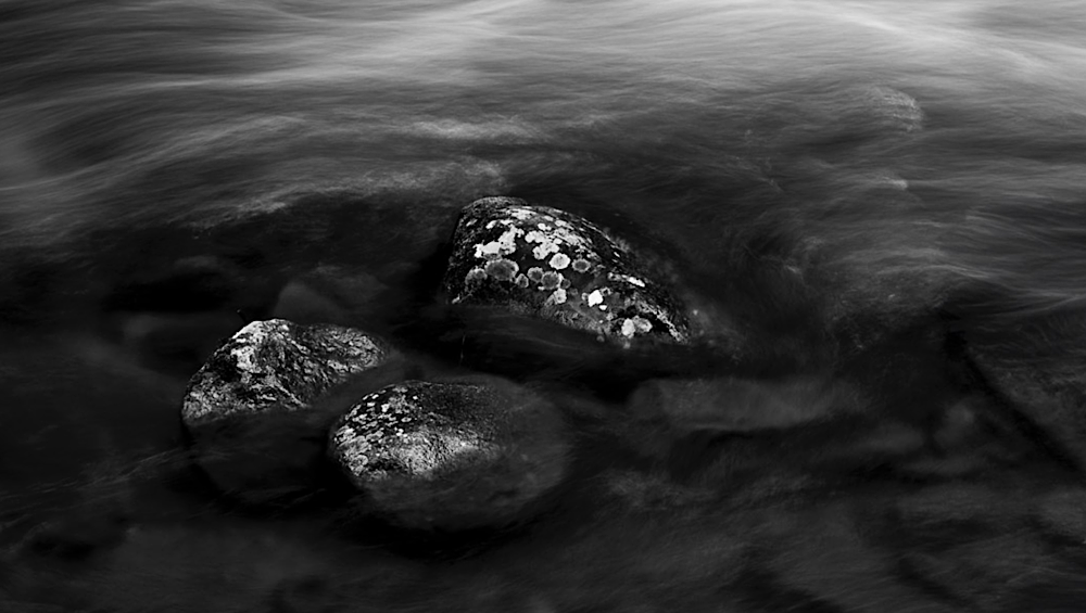 This is a nice mono abstract. The story is clearly rocks in a fast moving stream. Having looked at your image for some time, my eyes keep moving to the large expanse of white flowing water and ignoring the rocks. I thus wonder whether you need so much of the stream. You may feel the dark area at the top of the image to close the top off. But here is an alternative tighter crop. |