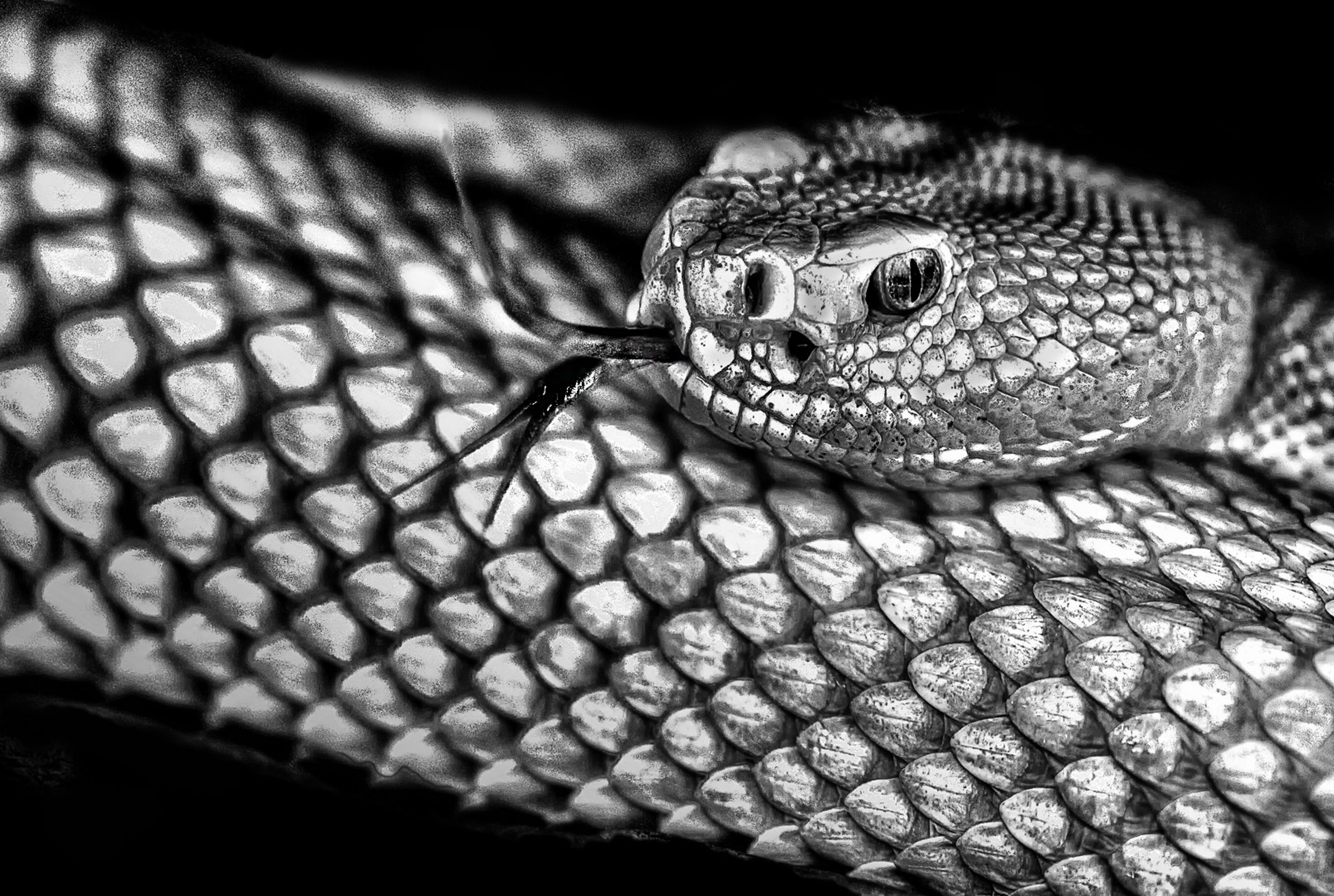 I made some changes you may wish to consider. I found the snakes setting a little distracting because of the pattern in the snake and background. Therefore, I selected the snake, created a masked exposure adjustment layer and darkened the background. Then I selectively burned areas with the brush around the snake to blend the background and snake. There seemed to be a harsh line around the top of snake close to the head and I was not sure if that was shadow. I was not sure whether that was an eye on the left side of the snake's head. To make the fangs more prominent, I burned them slightly. When I took the image back into LR, I noticed that the blinkies on the highlight warning indicator and they appeared around the head area. Therefore I brushed on reduced highlights to remove them.