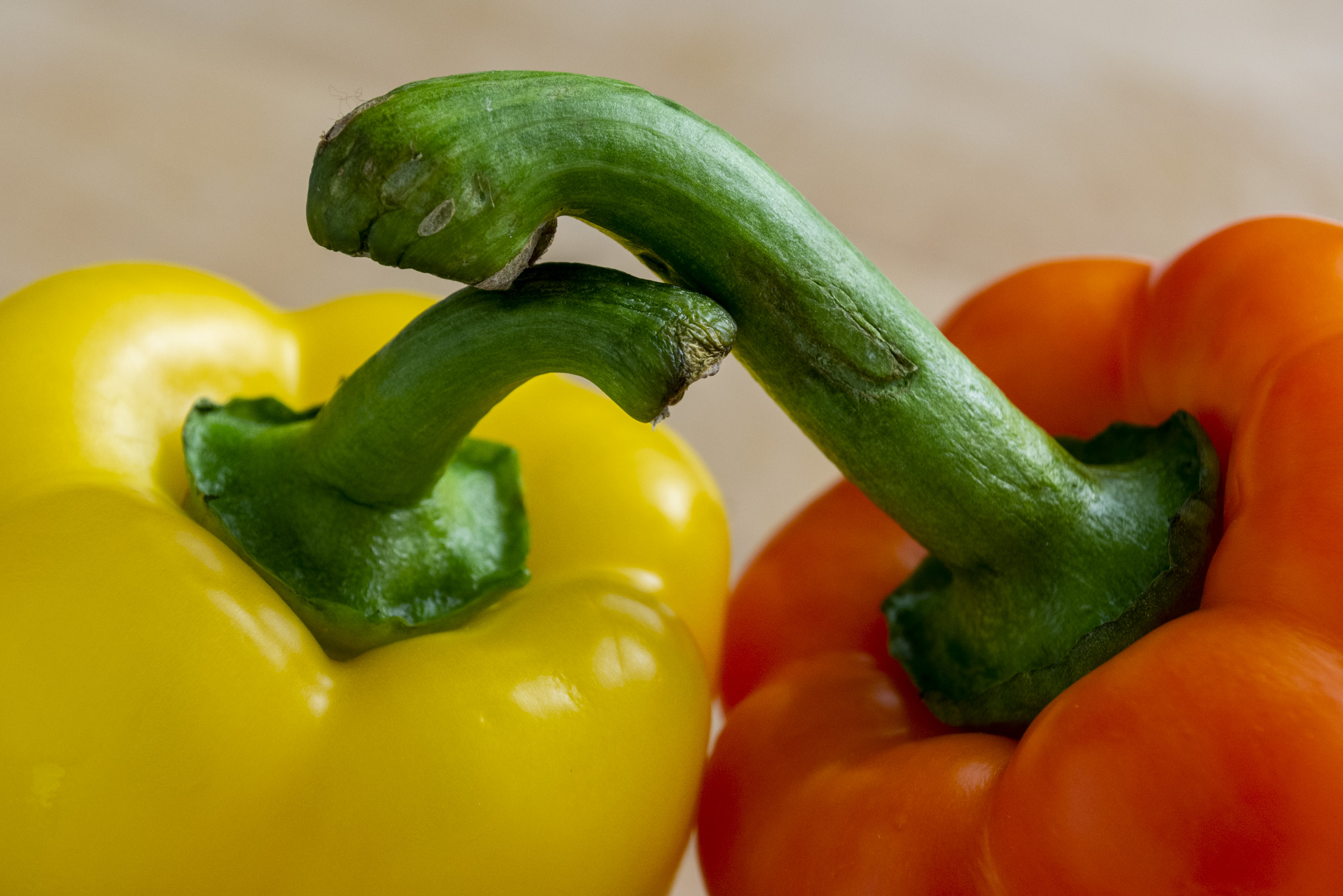 In my original color pepper image, color takes over, especially since yellow and orange are dominant colors against a neutral background. The meaning of the stems touching is lost.