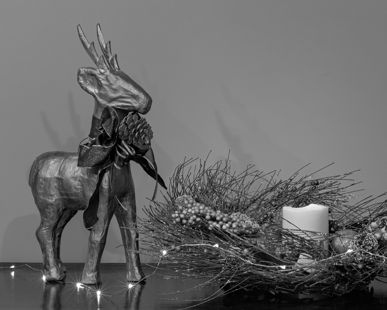 See image attached of the deer against a tan wall. The lights against wood do not stand out as much. There is not much contrast between the deer (gold) and the wall (tan). I could put the deer against a dark blue wall to get the tonal contrast. Pushing the blue slider to the left would darken the wall. For this image, a selection on the deer and pushing the yellow slider to the left to create more contrast did not solve the problem.