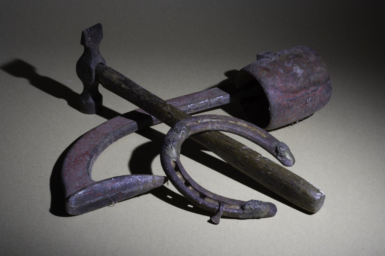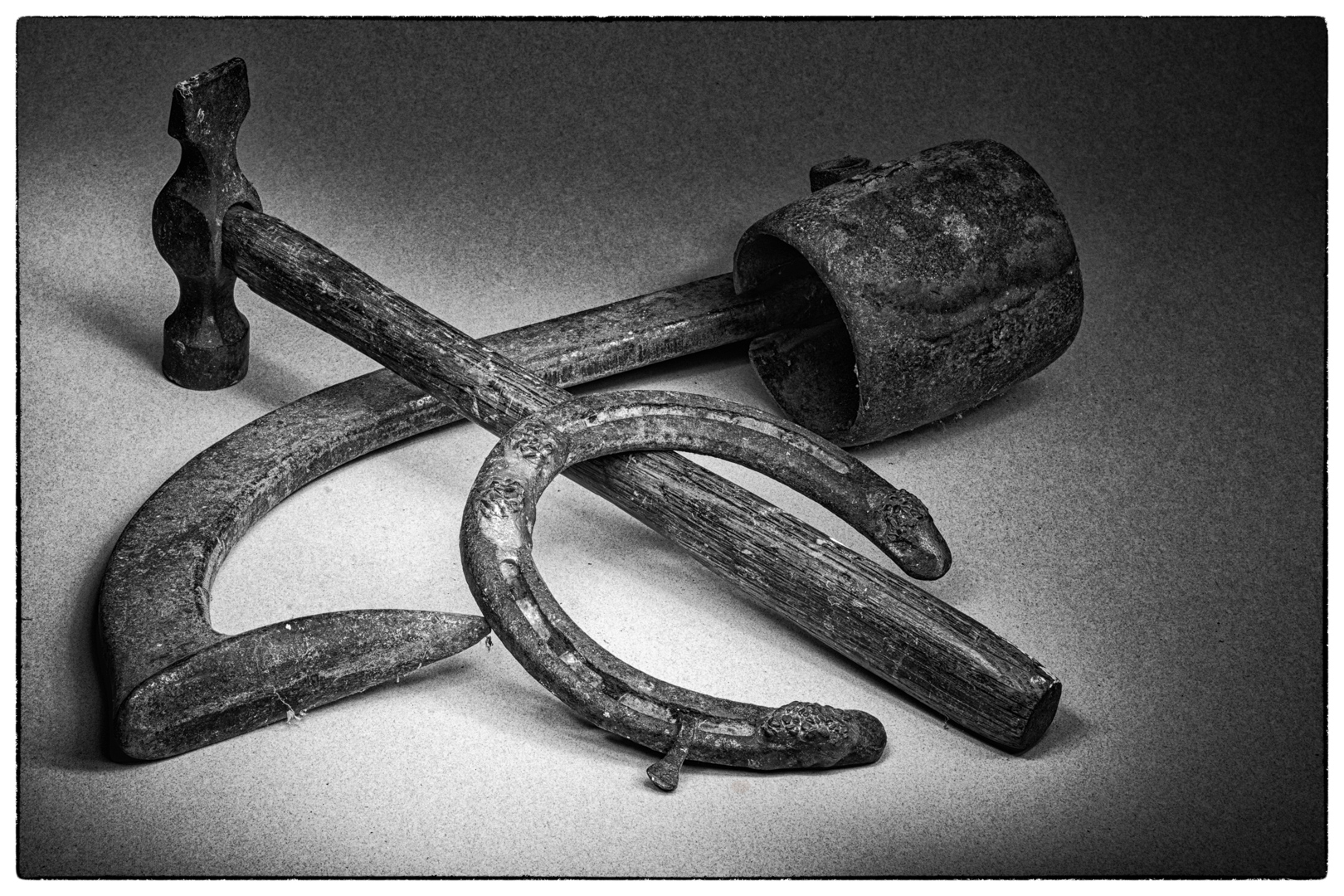 Attached is an image which I did not select because the shadow around the handle of the curved object camera right. This area lacked detail and thus merged into the surface. However, I did like the slight shadow cast from the horseshoe and under the hammer and the area within the horse shoe was not blown out and the natural vignetting. Note the different feel to this image. I could try dodging that shadow area but was trying for a 100 % correct image where I only used light room global edits and took the image into PS for dust spot removal. |