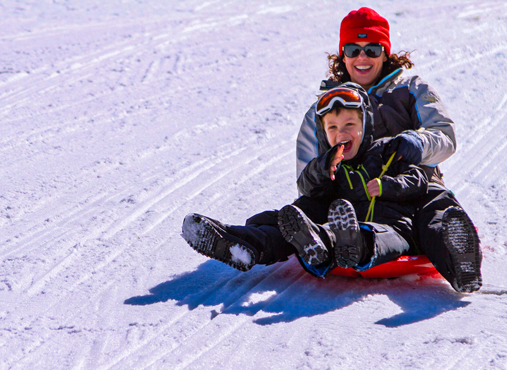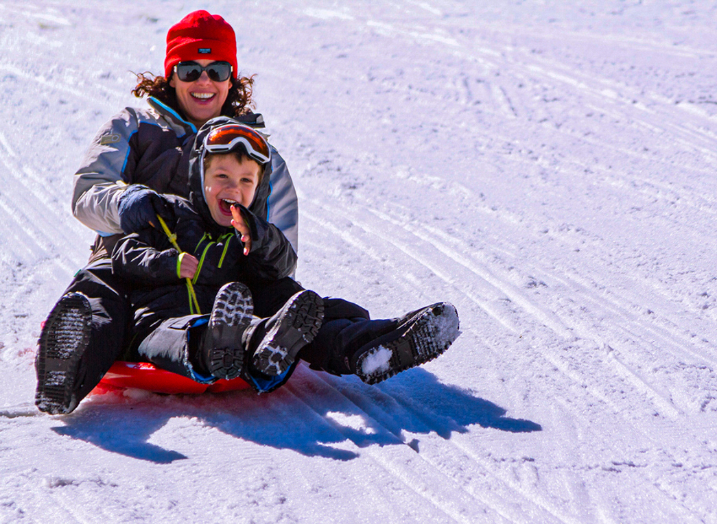 I find this image captures the joy of children and adults experiencing winter. The subject stands out clearly against the background and the pop of red in the hat, and tobaggan are interest points that tell the story of outdoor winter fun.