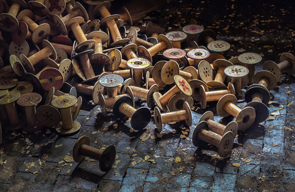 Your image is sharp and the colors are beautiful. The natural light quality is perfect for the scene. I don’t know if you laid out the pattern, but I enjoyed roaming around the image finding patterns. I added a radial to emphasize the spools I liked best, and which also enhanced the downward flow, in my opinion. You really are good at these shots. |