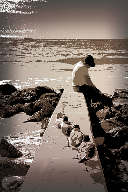 Small world after all. My deceased brother Dave started hid construction company in Bradenton before moving to Sebring. I know the area quite well. I find that abstracts hard to find an audience. I like this one with the caveat that I do not understand the red arm extension through his leg. The gulls lead us to the subject nicely. I might remove the first one though, as I think it competes with the subject. Lots of potential with this very nice composition. I had to play, just for a slightly different effect. |