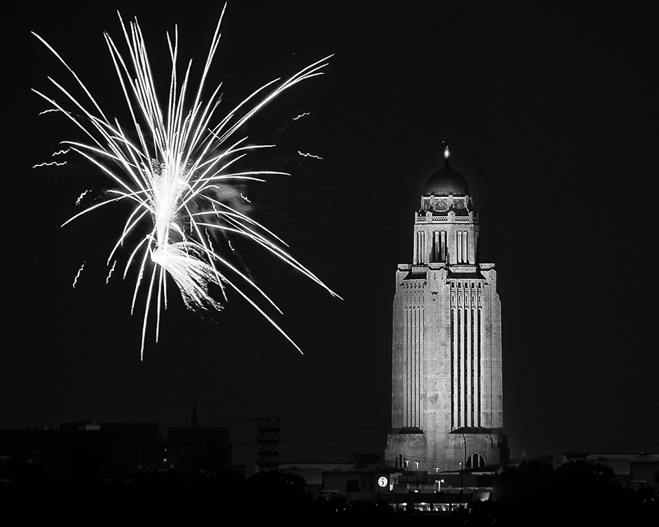 I guess I'd like more info about why you converted it to B&W. I like the clarity, and composition. I'd like more sky above the fireworks. You are usually pretty strong on contrast, so I took the liberty of adding some, and removing the other building to simplify the image. I like it overall, but I probably want my fireworks in color. |