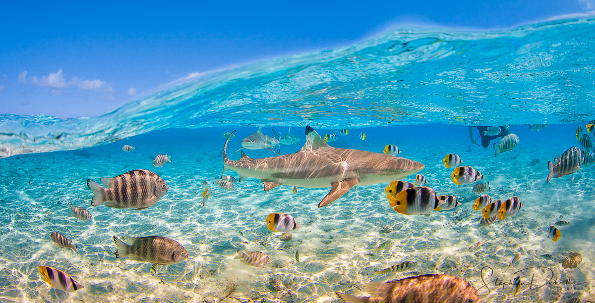 I can barely walk, only have one real arm to swim with, and live on the frigid waters of Puget Sound. I used to have salt water aquariums, with limited success. Most of my snorkeling was in Subic Bay and Hanama Bay, so I've never seen this grouping of fish before, but they are spectacularly sharp and the colors are as I've seen the mostly juvenile fish. Normally I'd expect coral and some vegetation, but if this is a typical lagoon in Bora Bora, I'd say that it has sparkling clear water. I'm quite envious, but have no recommendations on equipment I cannot afford. I would probably recommend playing around in LR with the Graduated Radial filter, and try different colors after you get into the filter. I tried selecting a couple of colors in the color picker and added two horizontal gradients, but you could also try a diagonal gradient which might unify better. Gradients may simplify your workflow on these type images, especially if you don't like using PS. |