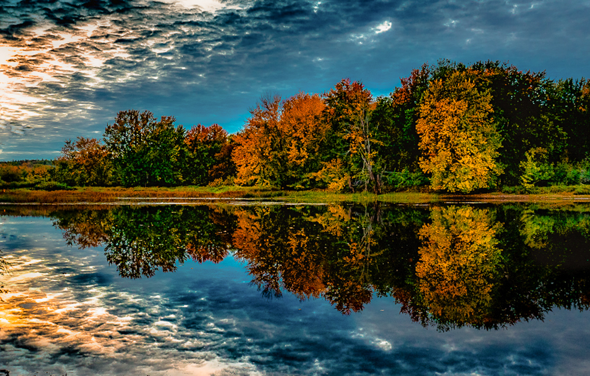 I really like this composition. Very dynamic lines, triangles, and reflections/ The entire image is sharp, and the color is great, but maybe a little darker and more saturated for my taste. I found the symmetry pleasing, and just slightly off. I'm adding a little light and leveled the image. Beautiful fall image. |