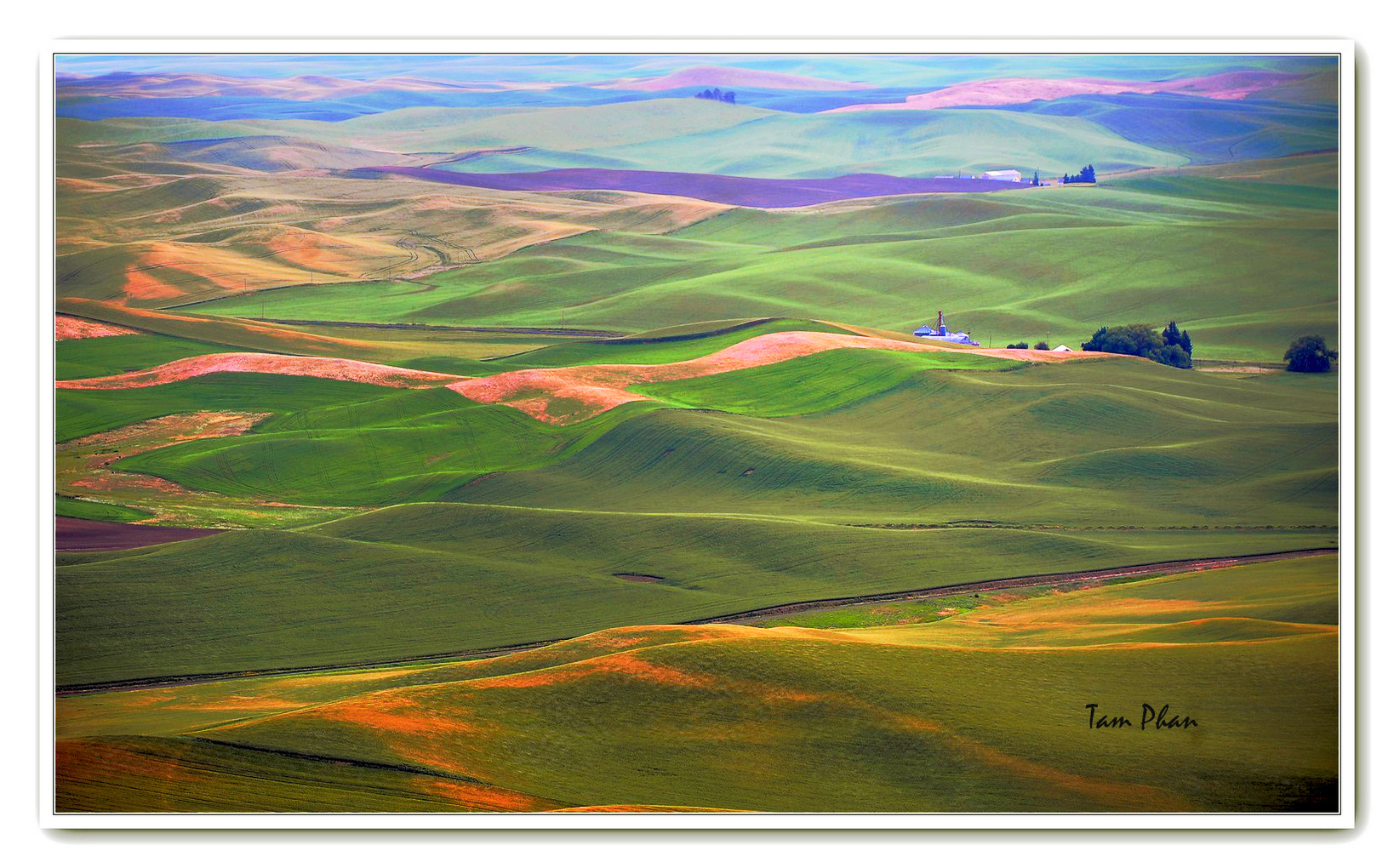 I'm unsure of whether this is a digitally framed image you took in the Palouse or an image of a wall-mounted image. Either way it is a work of art. It appears to me that you added a matte effect {or used matte paper if a print) and it lacks depth for me. Color is great in the Palouse and your image is too flat for me. Dodging and burning would help define the rolling terrain. As Judy observed the presentation is really well done. |