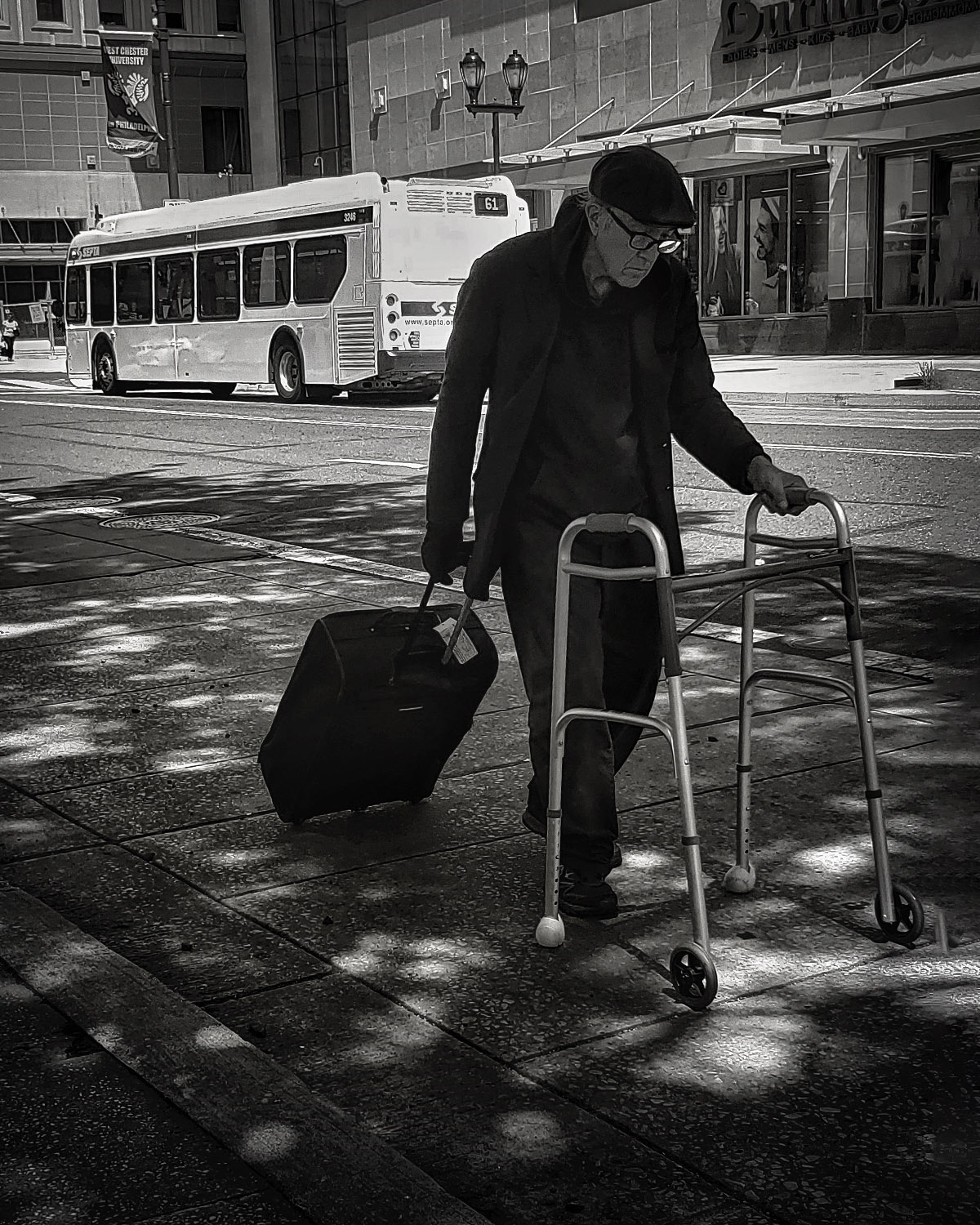 I like the story you have told. I think the image is sharp and the B&W conversion is excellent. I think a 4x5 crop would work well with this image and get rid of some of the excess building and sidewalk that I don't see fitting in with the man and the bus travel story. |