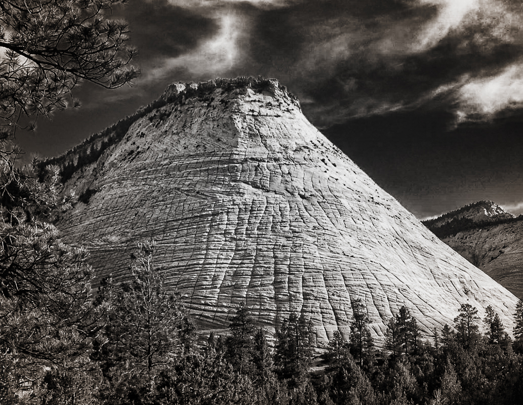 I think your composition is great. The B&W conversion helps with overcoming the flat (but not that bad) light. The second try is a little more dramatic. Be careful when sharpening that you don't introduce halos (look at the ridge.) Local sharpening, unsharp mask and halo removal are all well documented in online videos. IMHO the color version could also be processed into a winner. Great image. |